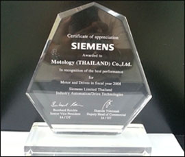 Awarded to Motology (Thailand) Co., Ltd. best performance in fiscal year 2008 And 2010,2011 and 2017 from SIEMENS Limited Thailand.
